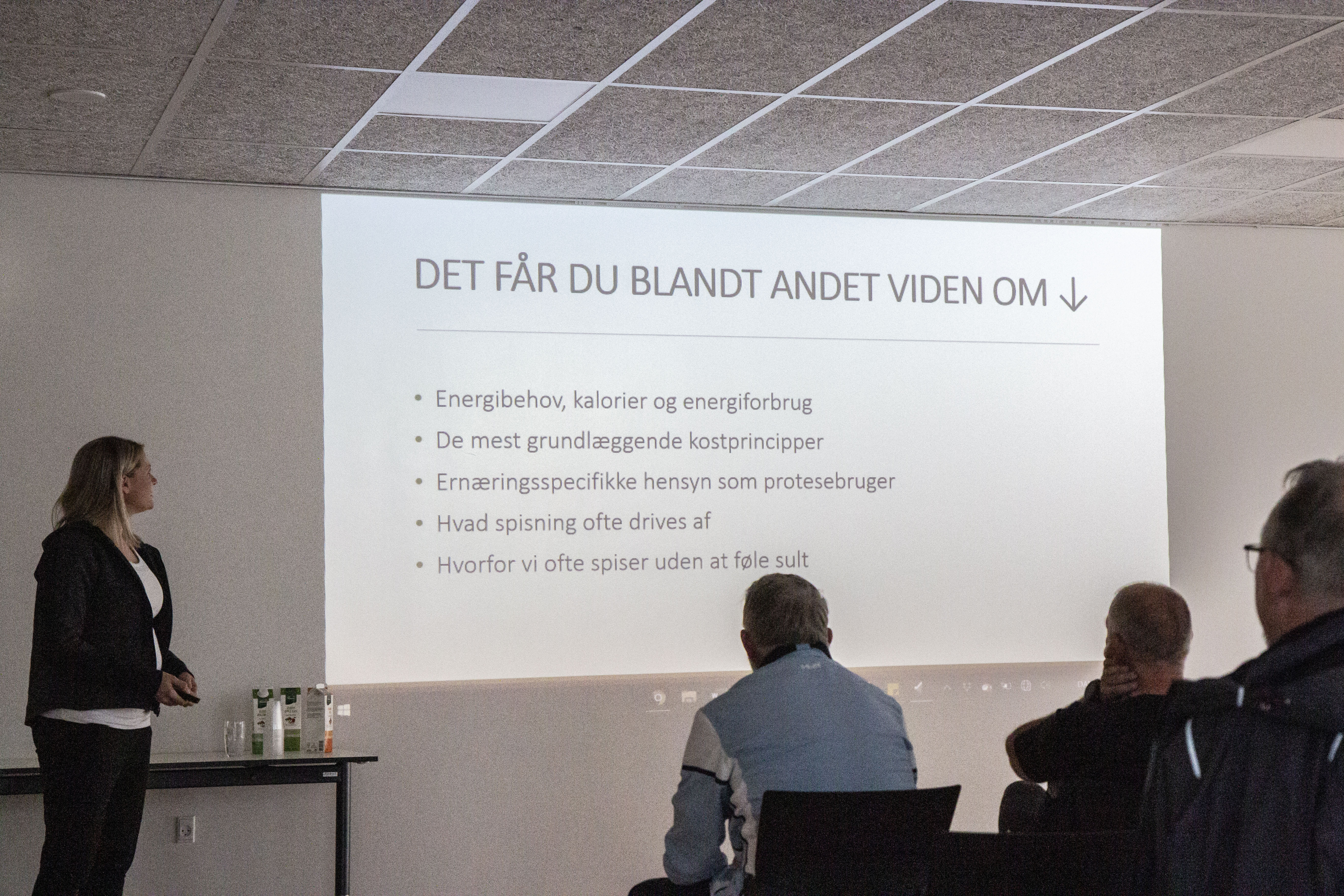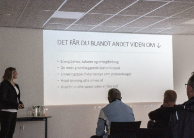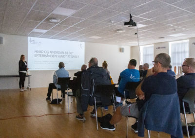 Efter en velfortjent frokost kunne deltagerne læne sig tilbage og få gode råd og vejledning med på vejen fra den professionelle ernæringsfysiolog, Jannie Haugaard. Til deltagernes store lettelse – eller i hvert fald til forfatteren af denne beretnings store lettelse – fortalte Jannie, at der ikke er noget mad, der er forbudt, hvis blot vi bruger vores sunde fornuft. Og så gav hun gode råd og stof til eftertanke om spisevaner.